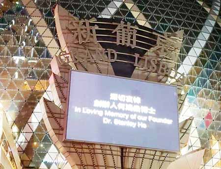 而在葡京和新葡京門外,懸掛的集團旗幟均下半旗致哀,建築物亦關閉燈光,電子屏幕顯示深切哀悼何鴻燊的字句;新八佰伴外牆的電子屏幕亦有顯示哀悼何鴻燊的字句。