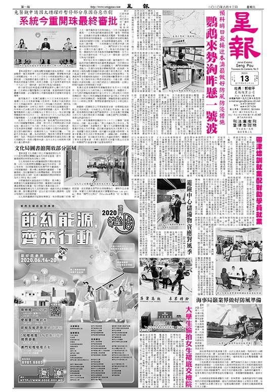 因應本澳現時正懸掛一號風球,文化局在此呼籲所有文物建築的負責人,尤其處於低窪地區的場所,做好防風及預防水浸等措施,對文物作出及時和必要的保護。同時,文物建築的負責人亦須密切留意氣象局發佈的最新天氣情況,採取相應的保護措施以確保文物安全。