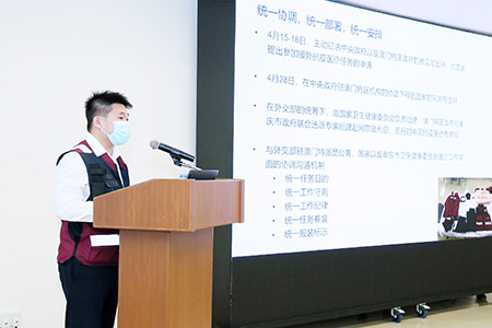 他並簡介了澳門隊員參與指導中資醫院應對新冠肺炎工作、現場培訓和視像連線培訓工作等情況,最後,他總結澳門隊員在任務中發揮切實擔任與外方聯絡和協調任務,確保專家組每天日程順利開展,向國際社會展示具有澳門特色的一國兩制合作成果。