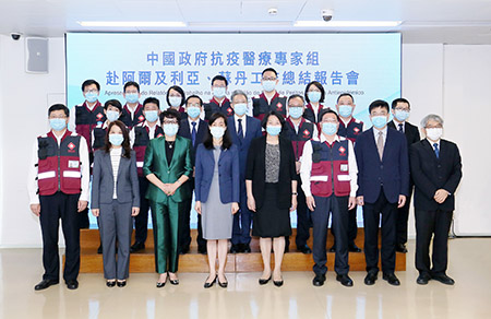 會上,擔任中國政府赴阿爾及利亞和蘇丹抗疫醫療專家組團長的重慶市衛生健康委員會周林副主任介紹了在阿蘇兩國抗疫工作的情況,並代表專家組感謝中央政府、澳門特區政府、重慶市政府及所有部門、駐阿蘇兩國大使館對醫療隊援外工作的大力支持,讓專家組順利完成任務。而柯量第一副團長則介紹了澳門隊員具體參與的工作內容和亮點,指出在官方交流中澳門隊員能主動提出建議,承擔口頭報告任務,還給予外方醫療機構切實可行的建議;