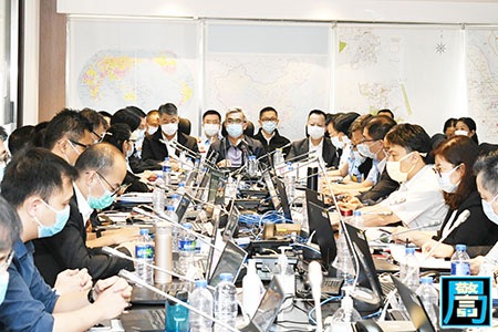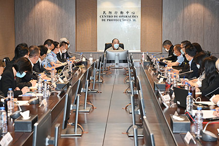 行政長官賀一誠認真聽取了保安司司長黃少澤、警察總局局長、民防中心聯合行動指揮官梁文昌及民防架構各部門領導的工作匯報,了解目前各部門工作及市面的情況。