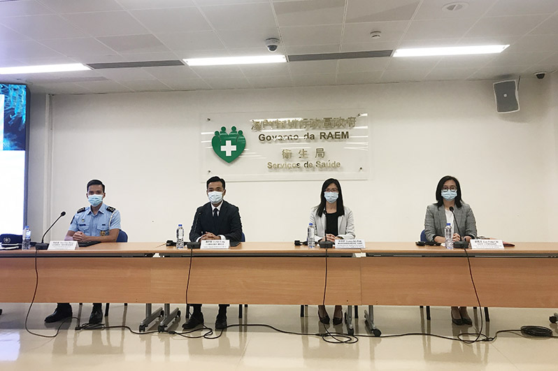 昨日新型冠狀病毒感染應變協調中心舉行例行記者會,仁伯爵綜合醫院醫務主任羅奕龍、治安警察局行動及通訊處處長馬超雄、旅遊局公共關係處處長劉鳳池、疾病預防控制中心傳染病防制暨疾病監測部協調員梁亦好共同會見傳媒。