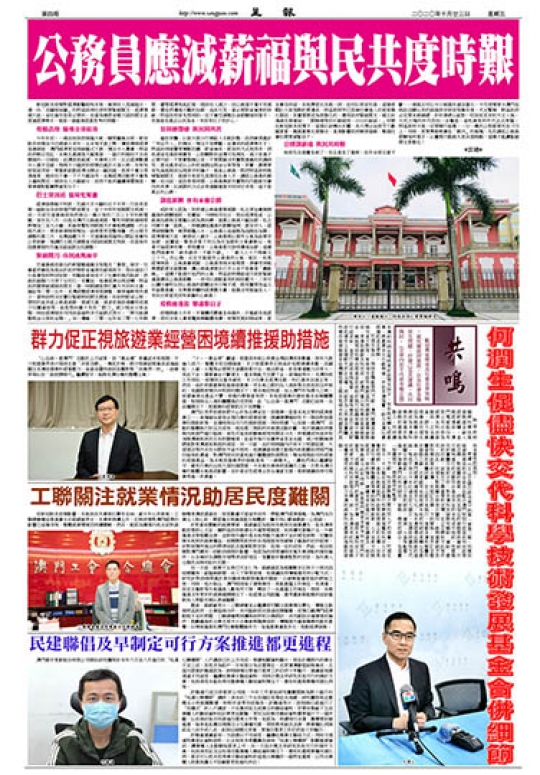 今年年初,一場浩劫突然降臨大地,瞬間癱瘓全球。新冠肺炎疫情至今已肆虐大半年,且未有平息之勢,導致環球經濟迅速倒退,澳門經濟更出現崩盤式下跌,情況令人憂慮。特區政府帳目見紅、本地生產總值大幅蒸發、一個月的賭收不及疫情前的一日賭收、訪澳旅客銳減、失業率上升,反正經濟數據令人慘不忍睹。現時不少國家的疫情仍處於水深火熱,在有效疫苗面世前,要重新啟動經濟沒辦法一蹴而就,旅客不會立即湧進來,賭收也不會一下子大幅回升,各類經濟活動更不會馬上遍地開花。財政收入大幅縮水,政府不能再繼續揮霍無度,要準備勒緊褲帶過苦日子。