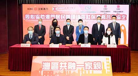 簽約儀式昨日在工聯大廈舉行,工聯與珠海市社會保險基金管理中心、中國工商銀行簽署「同心協助澳門居民辦理珠海社保業務合作協定」,希望為居民提供便捷,藉此進一步促進大灣區內人員流動,加快澳門融入國家發展大局的步伐。