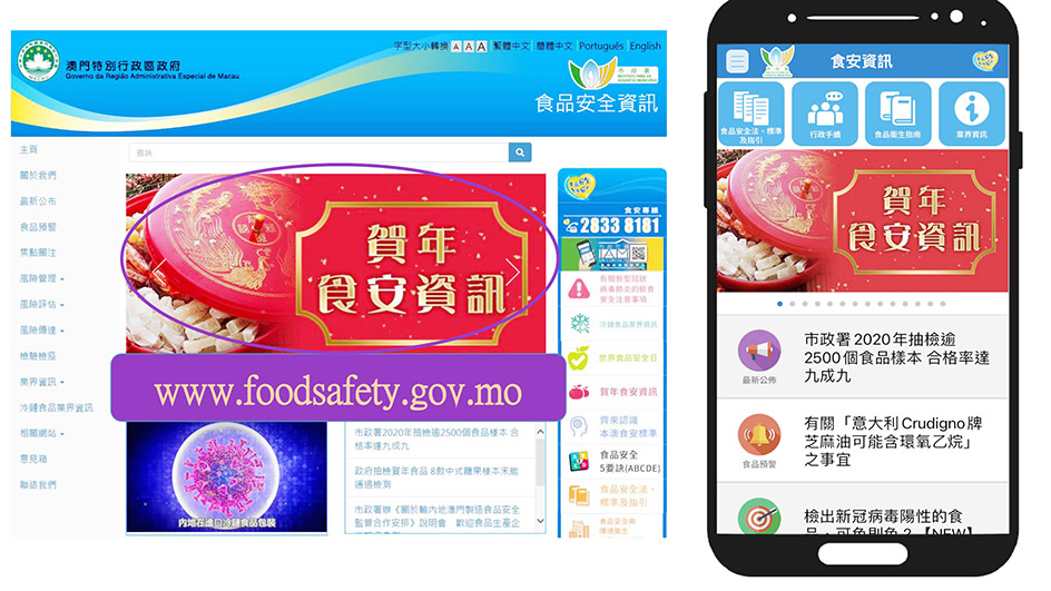 市政署已於食品安全資訊網開設「賀年食安資訊」專頁及「有關新型冠狀病毒肺炎的飲食安全注意事項」專頁,市民可登入www.foodsafety.gov.mo或下載「食安資訊」手機應用程式,獲取相關資訊。