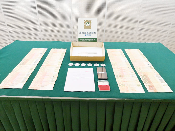 【特訊】一名內地男子懷疑賭敗後,在路氹城的酒店尾隨一名內地女賭客進入客房,持刀搶劫女事主五十萬元後,再威脅受害人簽借據及拍下還款聲明短片,製造受害人欠款假象,司警接獲案件調查後,在相關短片中發現破綻,相信疑犯涉及搶劫,於是將疑犯拘捕,探員在酒店的垃圾桶尋回涉案的刀,案件已移交檢察院處理。