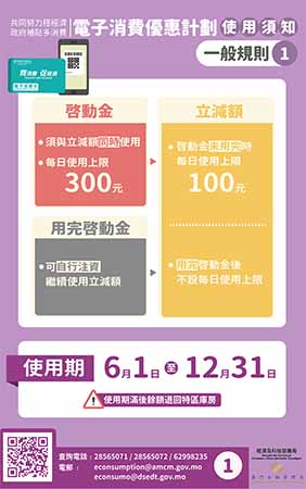 電子消費優惠包括五千澳門元的「啟動金」及三千澳門元的「立減額」兩部份,啟動金與立減額須同時使用。消費時,交易金額的25%(即七五折優惠)費用從立減額扣減,其餘的75%費用則從「啟動金」扣除。