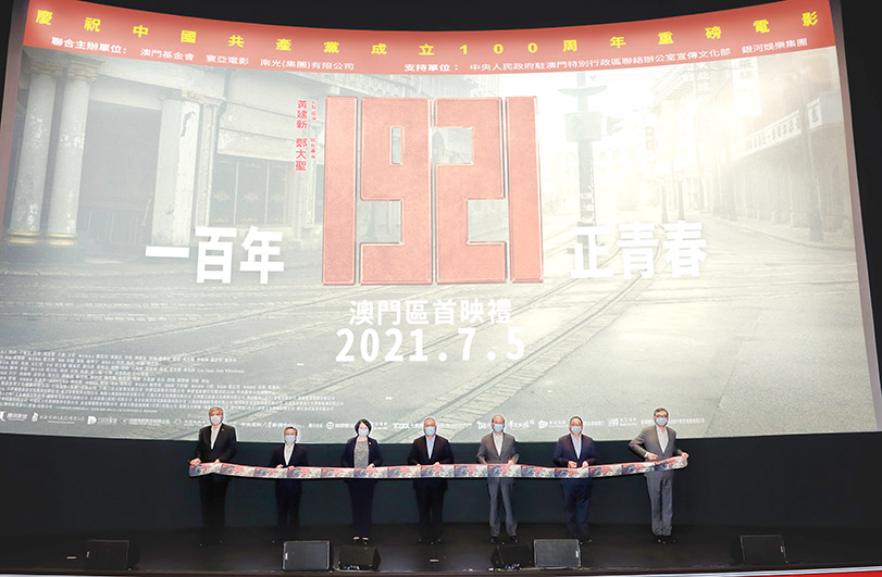 為慶祝中國共產黨成立一百週年,由澳門基金會、寰亞電影及南光(集團)有限公司聯合主辦,中聯辦宣傳文化部、銀河娛樂集團支持的《1921》澳門區首映禮昨日舉行。全國政協副主席何厚鏵、中聯辦副主任嚴植嬋、中華人民共和國外交部駐澳特派員公署特派員劉顯法、立法會主席高開賢、澳門基金會行政委員會主席吳志良、南光(集團)有限公司董事長傳建國及銀河娛樂集團副主席呂耀東為首映禮擔任主禮嘉賓,約一百四十位嘉賓出席觀賞電影。