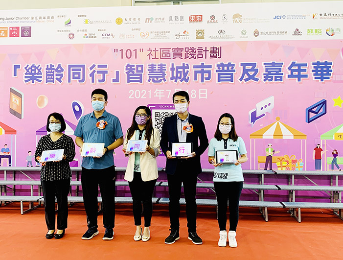 「樂齡同行」智慧城市普及嘉年華昨日下午假培正中學體育館舉行,中聯辦協調部副處長級助理梁錚、國際青年商會中國澳門總會會長梁偉基、社會工作局兒童及青少年服務處處長劉結艷、司法警察局關注少年組首席刑事偵查員梁文康等出席主禮。