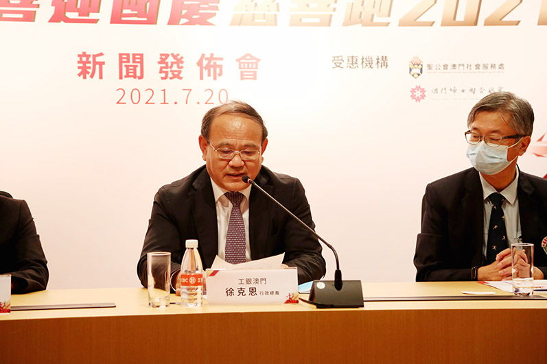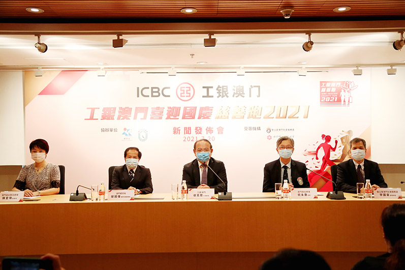 工銀澳門昨日舉行《工銀澳門喜迎國慶慈善跑2021》新聞發佈會,工銀澳門行政總裁徐克恩、體育局體育發展廳廳長鄒國偉、澳門田徑總會理事何永康、澳門婦女聯合總會副會長陳愛珠、聖公會澳門社會服務處服務總監李國豪出席。