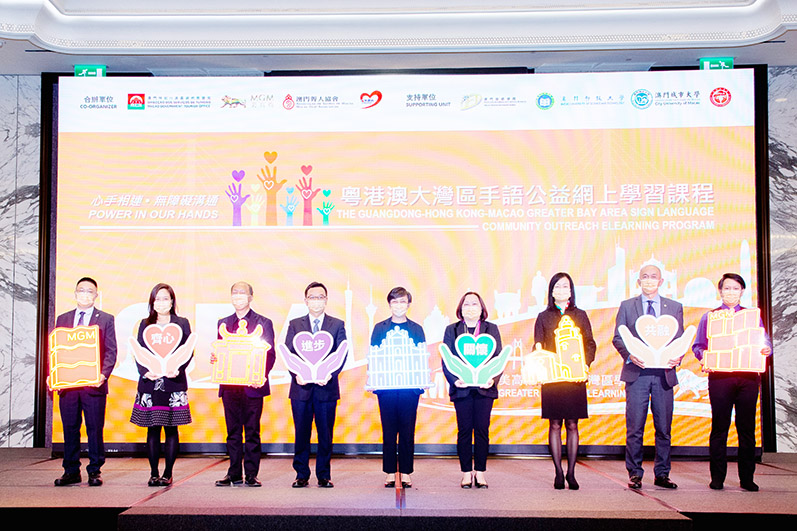 「心手相連•無障礙溝通 - 大灣區手語公益網上學習課程」啟動禮暨「共建無障礙旅遊」座談會由旅遊局、美高梅、澳門聾人協會及廣東省聾人協會合辦,澳門旅遊學院、澳門城市大學、澳門科技大學及廣東省手語協會作支持單位。出席啟動禮暨座談會的嘉賓包括:旅遊局局長文綺華;中央人民政府駐澳門特別行政區聯絡辦公室社工部副部長趙河清;美高梅人力資源行政副總裁余婉瑩;廣東省無障礙促進會秘書長、廣東省盲人協會副主席陳陽;澳門旅遊學院院長黃竹君;博彩監察協調局研究及資料分析處處長杜子柔;澳門科技大學酒店與旅遊管理學院院長吳國民;澳門城市大學國際旅遊與管理學院執行副院長李璽以及澳門聾人協會理事長黃鑒旋等。