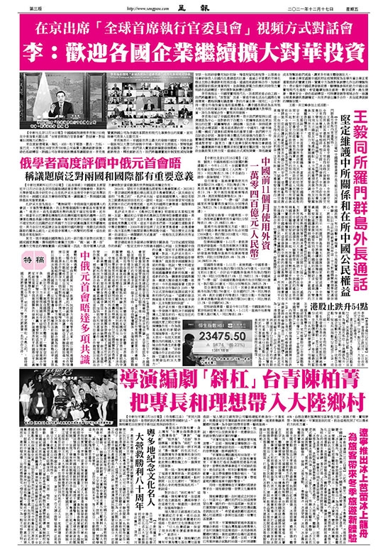 【中新社北京12月16日電】中國國務院總理李克強15日晚在中南海紫光閣出席“全球首席執行官委員會”對話會。對話會以視頻方式舉行。
