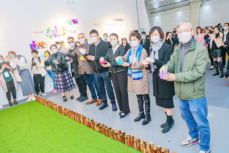 中聯辦宣傳文化部處長白冰、中國著名當代藝術家周春芽、立法會議員梁安琪、文化局文博廳代廳長盧可茵、婆仔屋文創空間主席馬若龍、「首屆中外潮流藝術大聯盟 – Super Art Fair」策展人華雨舟、「同樂」策展人呂澤強及澳門葡京人董事江陽昨日出席主持開幕儀式。