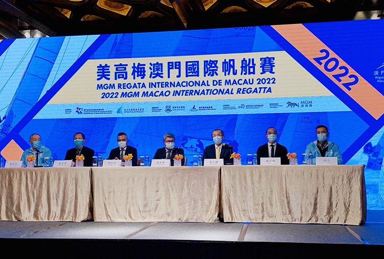 賽事主辦單位昨日在美高梅酒店宴會廳舉行新聞發佈會介紹詳情,體育局局長潘永權、北斗星航海賽事管理總監馬文偉、美高梅總裁兼首席戰略及財務官馮小峰、海事及水務局海事活動廳廳長黃文濤、澳門風帆船總會理事長蘇光輝、體育局副局長劉楚遠及林蓮嬌、賽事競賽官周亮、賽事仲裁團主席邵先利等出席。