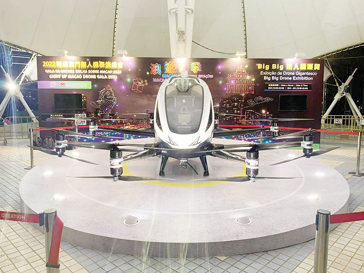 【特訊】「2022翱遊澳門無人機表演盛會」,觀眾除了可欣賞小型無人機在夜空中排列展示不同圖案的表演外,旅遊局還增設延伸活動Big Big無人機展覽,讓大家近距離觀看大型載人無人機,增加認識不同機種。