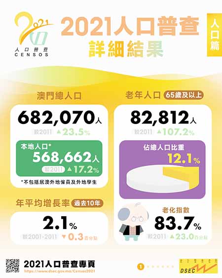 澳門人口老化持續,年齡在65歲及以上的老年人口較2011年大幅增加107.2%至82,812人,佔總人口12.1%,比重較十年前上升4.9個百分點,老化指數更上升23.0個百分點至83.7%。