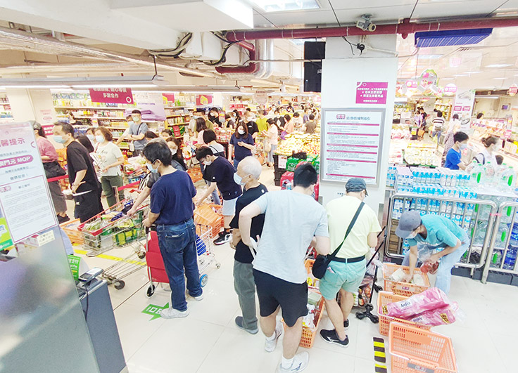 為防止新型冠狀病毒在澳門的傳播,本澳已進入即時預防狀態,自消息公佈後,昨日早上不少市民到各超市搶購食品及生活用品,多間超市出現排隊人龍,而進入超市都需要出示健康綠碼及測温。有市民表示,主要是政府呼籲不要外出堂食,所以購物多一些食品在家煮食。亦有市民稱,擔心外出堂食後出現與患者有共同軌跡的可能性,所以購買罐頭雜糧回家備用。有市民稱,目前未有超市貨品忽然提高價錢,街市的貨品價格亦與平日相約。
