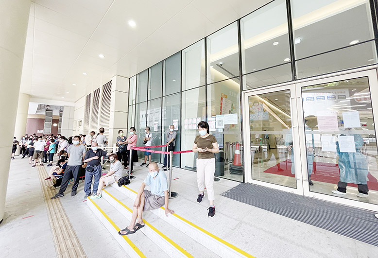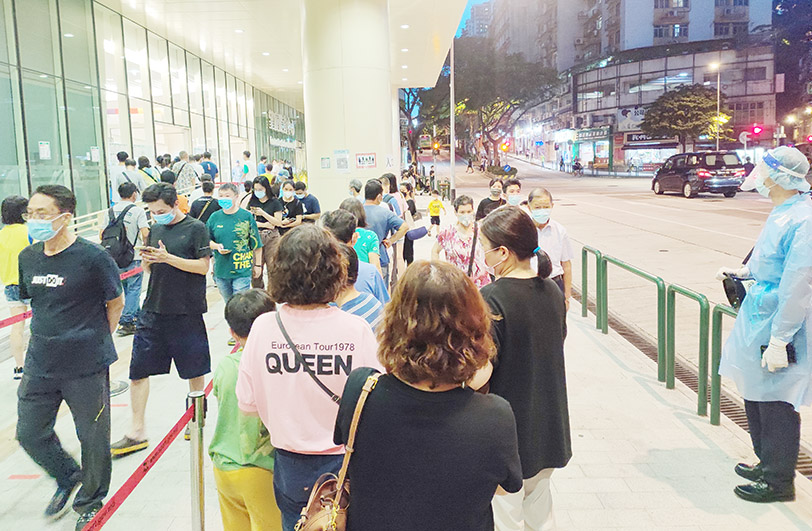 【特訊】新一輪全民核酸檢測,昨日早上九時至今日晚上十二時展開,多個核檢站昨日一度出現人龍,有輪候人士懷疑不適倒地,需要工作人員協助。截至昨日下午九時,已超過三十萬人次採樣,其中九萬三千多人次已有檢測結果呈陰性,共有五個十混一樣本呈陽性,現正進行單樣檢測。