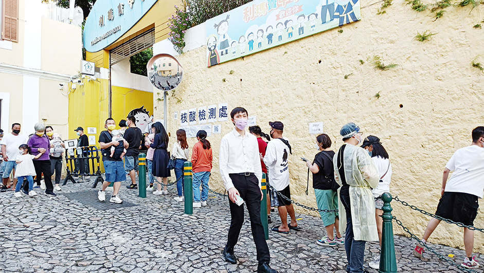 葡職中核檢站外有二百多人排隊,人龍一度延伸至勞動節大馬路。不少長者誤以為是檢測站屬關愛站無須預約,令不少長者一度聚集於門口,現場工作人員解釋站內設有的是「關愛通道」後人潮散去。在塔石體育館門外,前來檢測的人不算多,現場有廣播提醒出示健康碼及預約碼。有長者沒有預約希望排隊檢測,由工作人員帶領到關愛通道;亦有不少市民到場才生成健康碼。在海星中學核檢站,更有輪候人士懷疑不適倒地,需要工作人員協助。