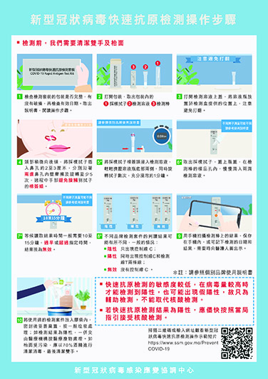 應變協調中心提醒,不同牌子的快速抗原檢測套裝操作步驟可能稍有不同,使用前須先閱讀套裝內的使用說明書,按操作程序進行檢測,並協助家中有需要人士 (如長者)透過澳門健康碼申報檢測結果。