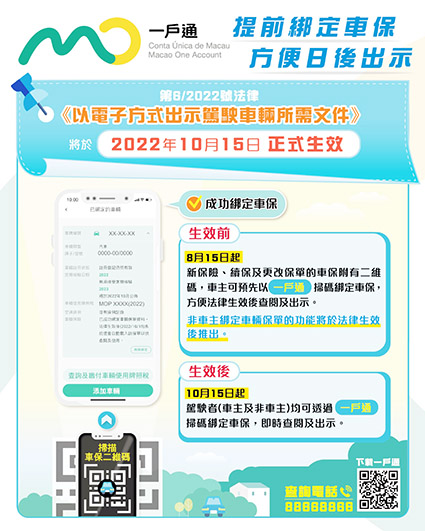 為配合上述法律的實施,由即日(8月15日)起,6間保險公司在新購買的保險、續保及更改保單的文件內印有車保二維碼,車主可預先透過「一戶通」掃碼綁定該車保。車主在綁定車保前,需事先透過「一戶通」中「我的車輛」功能,以個人身份綁定名下車輛。之後點擊「一戶通」首頁上方的掃碼按鈕,掃描保單上的二維碼,有關保險資料便會自動綁定在「一戶通"「我的車輛」內。