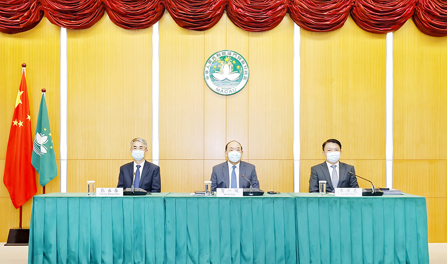 【特訊】行政長官賀一誠於9月24日率領行政法務司司長張永春、經濟財政司司長李偉農,在政府總部召開新聞發佈會,公佈中央支持澳門疫後經濟復甦、加快基礎設施建設,以及推動經濟適度多元發展等一系列惠澳措施。