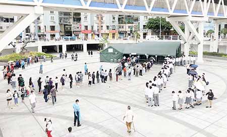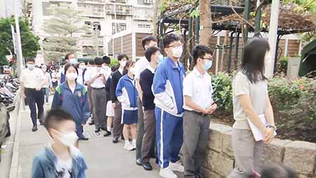三號風球下,幼兒園及小學停課,中學生照常上課。有學校組織中學生到就近核檢站採樣。其中坊眾學校昨日早上,由老師分批安排學生到附近休憩區的核檢站採樣,站內設有學生專道;而勞校中學亦組織四十一個班,約一千四百名學生分批到核檢站核檢;有學生認為,學校組織採樣較方便,亦有學生稱,學校按各班合適時段安排到場採樣,對課堂學習不受影響。有家長認為,全民核檢應停課,並認為政府公布措施太急,昨日早上風雨不算大,戶外核檢站仍安全,但亦需注意。