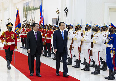 會談前,洪森在和平大廈為李克強舉行隆重歡迎儀式。兩國總理登上檢閱台,軍樂隊高奏中柬兩國國歌。李克強在洪森陪同下檢閱了儀仗隊。