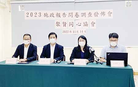 聚賢同心協會理事長林倫偉、副理事長李靜儀、梁孫旭和秘書長高岸峰進行發佈會。高岸峰表示,是次調查於十月中開始進行,主要透過網上方式收集,共收到一千八百二十六份問卷。調查顯示,受訪者在明年的施政報告中,最關心的幾個範疇依次是「經援措施」佔百分之四十二點七、「控制物價」佔百分之三十七點二、「經濟發展」佔百分之三十三點八及「房屋政策」佔百分之三十二點三。可見市民較關心經濟問題及相關措施,房屋問題都是市民的關注重點。