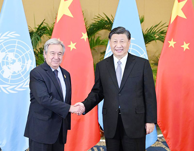 習近平強調,中國是以聯合國為核心的國際體系的堅定支持者。要實現世界和平,《聯合國憲章》宗旨和原則必須遵守,各國合理安全關切必須重視。當前全球發展進程面臨前所未有的挑戰,發展中國家特別是脆弱國家受到嚴重衝擊。我們要將發展置於國際議程中心位置,培育全球發展新動能,構建全球發展夥伴關係,推動實現更加強勁、綠色、健康的全球發展,讓發展成果更多更公平惠及每一個國家、每一個人。在這方面,各國應該說到做到,多曬成績單,而不是喊口號。中方願同聯合國加強合作,共同推進全球發展倡議、全球安全倡議取得實實在在的成果。我們將以中國式現代化推動人類整體進步,以中國新發展為世界帶來新機遇,為動蕩的世界提供更多穩定性和確定性。中方將繼續堅持真正的多邊主義,堅定支持聯合國的工作。