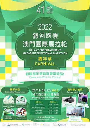 為增加賽事氣氛,由11月27日至12月4日一連八天,將在「澳門百老匯TM」美食街舉辦「2022銀河娛樂澳門國際馬拉松嘉年華」,活動內容豐富,包括:歷屆獎牌展示、有獎遊戲攤位及大抽獎,亦有不同類型的體育用品展出,包括運動服飾、補充品及醫療保健品等,並設有購物優惠,藉舉辦有關活動營造濃厚的賽事氛圍,而馬拉松嘉年華的開幕儀式將於11月27日下午4時於百老匯舞台1樓舉行,歡迎市民及旅客到場參與。