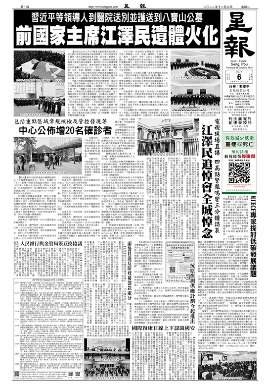 警察總局表示,前國家主席江澤民追悼大會於本月六日上午十時在北京人民大會堂隆重舉行。配合特區政府的悼念活動,於當天上午十時,本澳四個高點警報系統(分別設於松山燈塔、氹仔大潭山、路環疊石塘山及澳門保安部隊高等學校)將鳴響三分鐘誌哀,敬請各位市民留意有關安排。