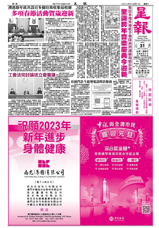 另一方面,按照傳統,巿民在農曆新年前夕有大掃除的習俗或會更換大型家具,垃圾量相應增加,市政署聯同澳門清潔專營有限公司於明年一月八日至一月二十一日(農曆年十七至年三十)期間,在澳門和離島區設置一百三十四個大體積垃圾收集站。當中澳門半島設一百零九個,氹仔及路環則分設十六個及九個。為方便巿民識別收集站的位置,收集站旁會設置指示牌,並透過播放電台廣告、刊登報章廣告、張貼海報及於市政署網站發佈相關資訊。