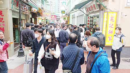 本澳與內地昨日(八日)起基本回復免核檢通關,免核檢通關首日的下午,本澳中區及氹仔旅遊區人流明顯增加,不少店鋪都十分暢旺場,尤其體育用品店迫滿顧客,部分小食店大排長龍,部分旅客拖行李箱來澳購物滿載而歸;亦有旅客特意到藥房購買止咳等藥品。