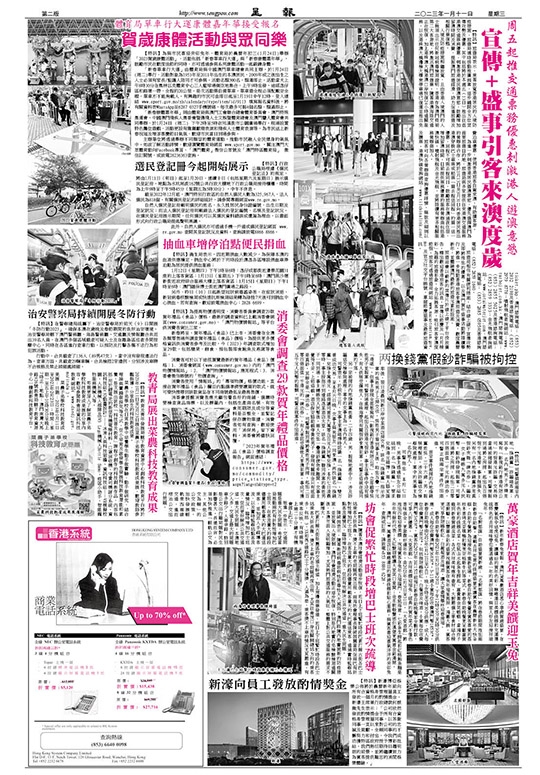「新春單車行大運」由體育局與中國澳門單車總會共同主辦,於1月24日 (周二)舉行,活動對象為1953年至2011年出生的本澳居民,2009年或之後出生之人士必須有家長/監護人陪同才可參與。活動名額300名,額滿即止。活動當天上午8時30分在奧林匹克體育中心三人籃球場側空地集合,上午9時出發,途經氹仔區和路環一帶,全程約20公里。是次活動需自備單車,單車遊全程必須配戴安全帽,單車亦不能夠載人。有興趣的市民可由即日起至1月19日中午12時,登入連結 www.sport.gov.mo/zh/calendary/type/item/id/9113 填寫報名資料後,將有關資料表WhatsApp至6287 0327手機號碼,每次最多可報4個名額,額滿即止。