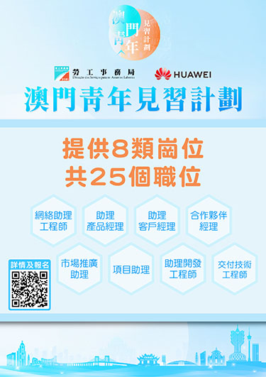 勞工局與華為合作推出見習計劃,讓澳門青年通過實務場景,在企業資深人員指導下,從中了解數字化轉型技術、資訊與通信技術、智慧城市領域完整的業務生態圈,培養青年相關業務能力的成長,藉此拓展澳門青年的就業發展空間。