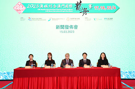 賽事組委會昨日(15日)舉行新聞發佈會,介紹活動詳情,出席嘉賓包括體育局局長潘永權、澳娛綜合常務董事何超鳳、中國澳門龍舟總會會長賴百齡、市政署廳長高佩珊、行政公職局處長陳思恆等。