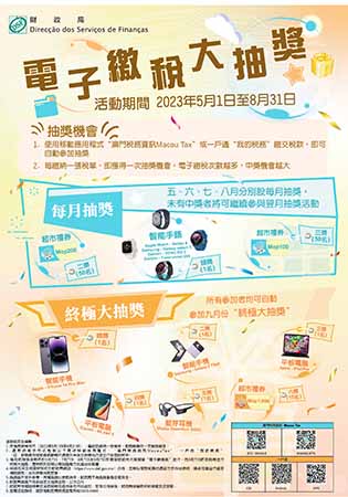 每年首季為報稅高峰期,為鼓勵納稅人利用手機及或網上報稅,財政局特別推出電子申報抽奬活動,於2023年首季透過電子方式進行報稅或遞交稅務申請者即自動參加抽奬,第一期的抽奬已結束,合共323名得奬幸運兒。