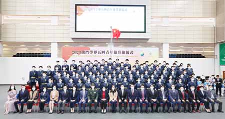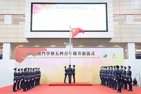 “澳門學界五四青年節升旗儀式”於2023年5月4日早上8時在澳門理工大學體育館舉行。在濠江中學管樂團現場奏樂下,澳門學界升旗隊隊員隨著音樂步操向升旗台,並在莊嚴的中華人民共和國國歌奏起時升起國旗。同時,在聖家學校、勞校中學附屬小學、陳瑞祺永援中學、培正中學及中葡職業技術學校5所學校合唱團的帶領下,場內眾人共同高唱國歌,場館響徹嘹亮的歌聲,洋溢高漲的愛國之情。隨後,司儀在台上介紹五四運動的緣起,以及由澳門大學附屬應用學校陳安之同學以演講方式傳承五四的精神。