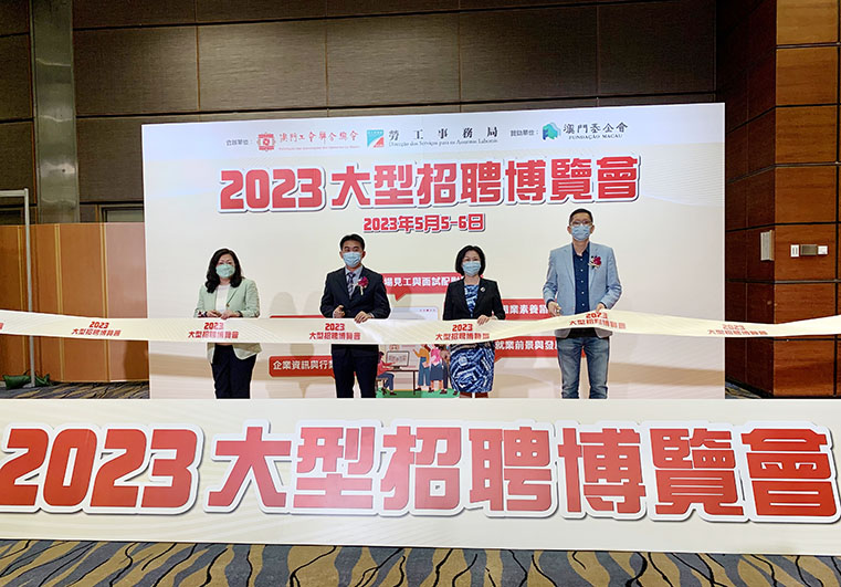 「2023大型招聘博覽會」開幕儀式昨午假旅遊塔會展娛樂中心四樓舉行,由中聯辦社工部處長羅振宇、勞工局代副局長就業廳廳長李麗琼、橫琴粵澳深度合作區民生事務局副局長許鳳梅、以及工聯理事長李從正主禮。