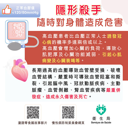 【特訊】衛生局表示,為加強大眾對高血壓及其嚴重併發症的認識,廣泛宣傳相關預防、檢測和治療的資訊,世界高血壓聯盟於2005年5月14日首次向全球倡導舉辦“世界高血壓日”宣傳活動,並將每年5月17日定為“世界高血壓日”。今年主題則是“Measure Your Blood Pressure Accurately, Control It, Live Longer”(即“準確測量,有效控制,健康長壽”),目的是提升公眾對高血壓危害的認知,及對高血壓控制的關注,倡導醫療機構和家庭使用合格的設備和標準化的方法以精準測量血壓,讓大眾瞭解自己的血壓和控制血壓的方法,使醫護人員瞭解患者的血壓,以提供健康生活方式指導和有效的降壓治療,延長健康壽命。