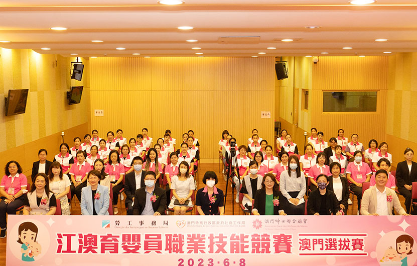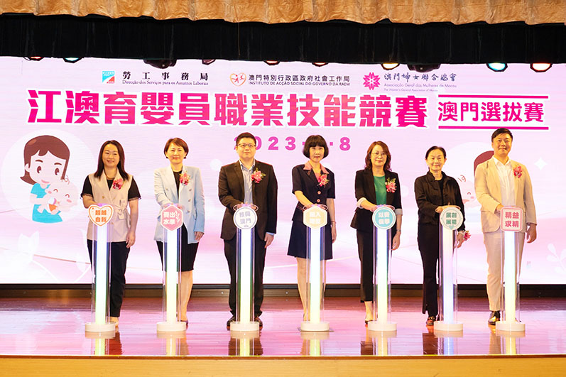由勞工事務局、社會工作局、婦聯合辦之第一屆「江澳育嬰員職業技能競賽──澳門選拔賽」昨日舉行啟動禮,中聯辦社工部副部長朱宏、勞工事務局代局長陳俊宇、社會工作局代局長許華寶、婦聯理事長袁小菱和監事長容永恩等出席主禮。