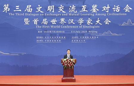 【中新社北京7月3日電】7月3日,第三屆文明交流互鑒對話會暨首屆世界漢學家大會開幕式在北京舉行,會上宣讀了習近平主席賀信。國家副主席韓正出席並致辭。