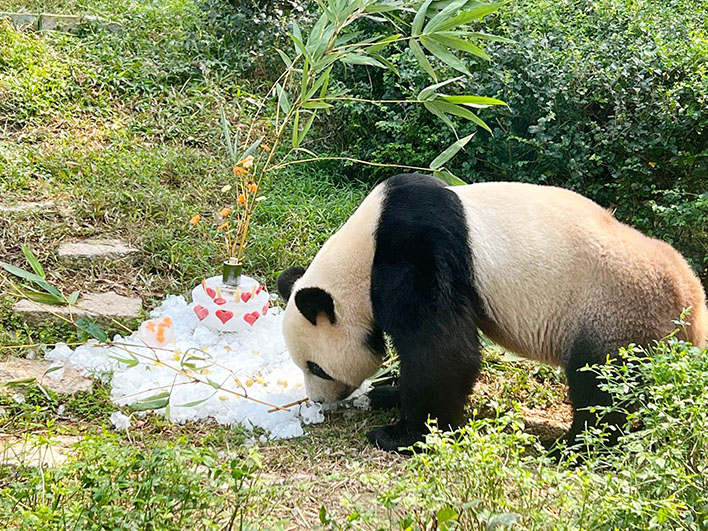 飼養員特意為大熊貓開心家族送上精緻而冰涼的冰蛋糕,冰蛋糕主要以冰塊製作,加上蘋果、南瓜、胡蘿蔔等蔬果,以高纖維餅乾等作點綴,兼顧可口與健康,在炎炎夏日裡為開心家族送上消暑美食。師生們亦為大熊貓製作生日卡,為大熊貓送上滿滿的祝福。