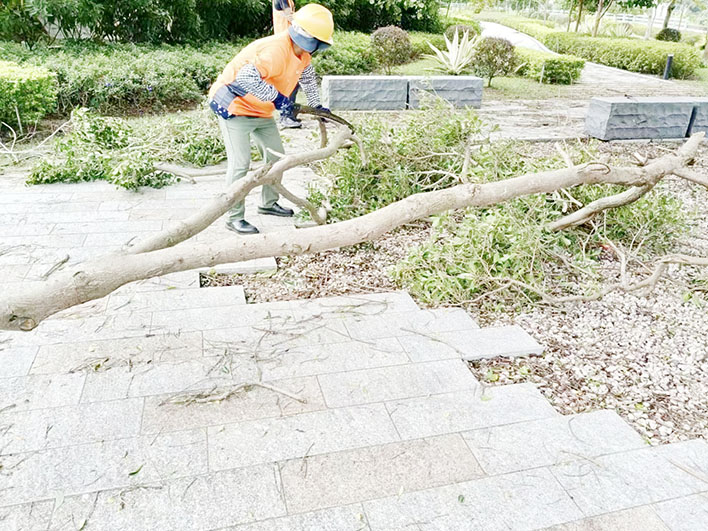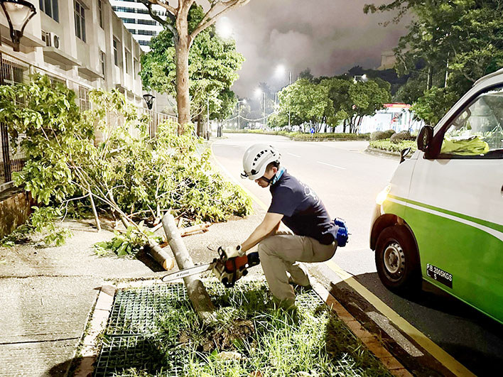 在改掛八號風球後,市政署已加派人手清理行車路面上倒塌樹木及斷枝,首要開通本澳各主要幹道的交通。經排查,各區馬路行人道逾二百八十棵行道樹倒塌、約六百株有不同程度折枝,至昨日(3日)中午,已處理約7成。