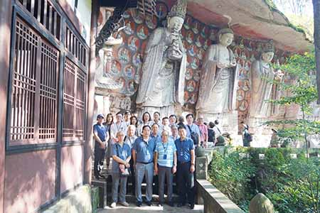 在大足石刻寶頂山大佛灣,釋迦涅槃聖跡圖、千手觀音像、華嚴三聖像等精緻且宏偉的石刻造像群,吸引一行駐足觀看,一邊聆聽講解員講述南宋蜀中名僧趙智鳳耗費畢生心血,主持建造寶頂山石刻的動人故事,一邊用手機、相機不停記錄眼前世遺的精妙雕刻。