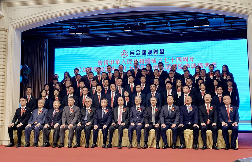 慶祝中華人民共和國成立七十四周年、民眾建澳聯盟成立十五週年酒會暨第六屆理監事就職典禮,昨午假萬豪軒酒樓舉行,中聯辦主任鄭新聰、立法會主席高開賢、張永春、保安司司長黃少澤、審計署長何永安、警察總局局長梁文昌、海關關長黃文忠、立法會副主席崔世昌、民眾建澳聯盟創會主席陳明金和吳在權等出席。