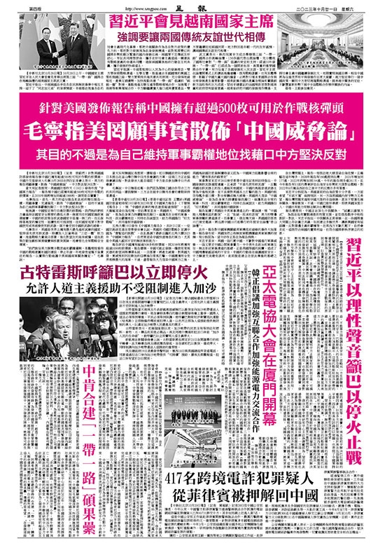 【中新社北京10月20日電】(記者 張蔚然)針對美國國防部發佈報告稱中國已擁有超過500枚可用於作戰的核彈頭,中國外交部發言人毛寧10月20日在例行記者會上表示,美方的報告罔顧事實,散佈“中國威脅論”,中方對此堅決反對。