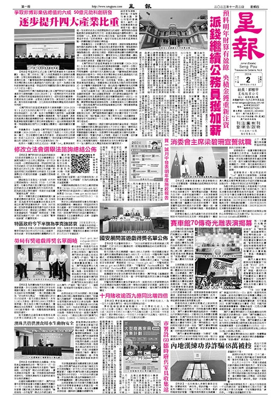 【特訊】特區政府正式公佈《澳門經濟適度多元發展規劃》,提出二零二四年至二零二八年經濟適度多元發展的具體目標、主要任務和重點項目。其中規劃提出,將逐步提升四大產業的比重,不斷增強經濟的發展動能和綜合競爭力,爭取未來非博彩業佔本地生產總值約六成的比重。此外,為建設支撐科創發展的資金渠道,特區政府於規劃期內對本澳科創研發投入不少於五十億元。