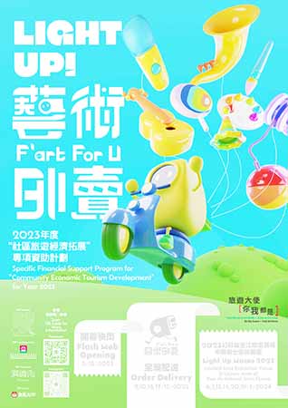 “Light Up!藝術外賣”推出新玩法,將全澳各地區化身光影遊樂場。活動分三部份:開幕快閃、藝術外賣全澳配送、駐點餐車展場。12月2日在“2023幻彩耀濠江”相關場地進行快閃表演;12月9、10、16和17日提供藝術外賣全澳配送,事先透過指定手機APP下單後將送上盲盒式的藝術外賣;1月6、7、13、14、20和21日在飛喇士街休憩區設“2023幻彩耀濠江”限定餐車展場。活動詳情及藝術外賣下單方式,請掃描海報上的二維碼,關注活動公眾號的資訊。